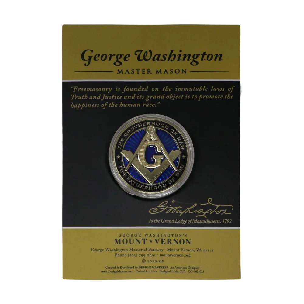 This gold, blue and black 1 ¾” commemorative coin is inscribed on one side with “George Washington Master Mason August 4, 1753 – Third Edition.” The flip side features the masonry insignia and inscription “The Brotherhood of Man – The Fatherhood of God.”