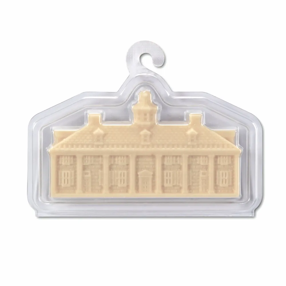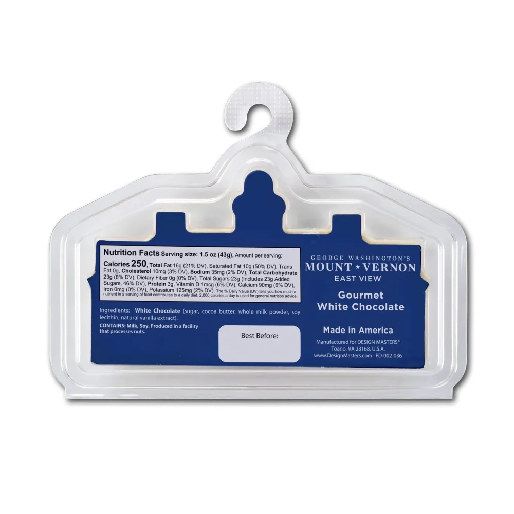 This exquisite 2 oz. white chocolate bar is shaped like the East Front of the iconic Mount Vernon Mansion, capturing the elegance and detail of George Washington’s beloved home. At 2.25″ high by 4″ wide, this delightful creation offers both a visual and flavorful treat.Â