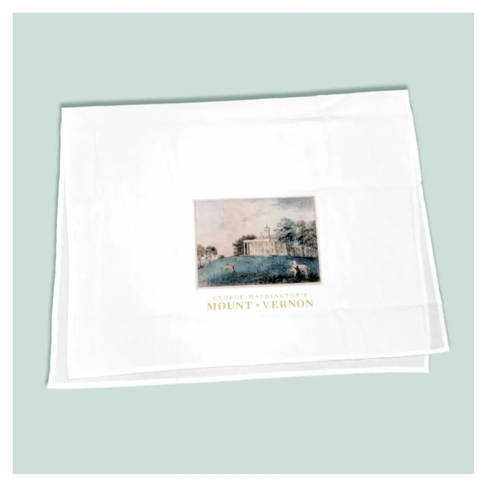 Each towel displays a reproduction of the East front of the Mount Vernon mansion overlooking the Potomac river with George Washington’s Mount Vernon printed below picture.