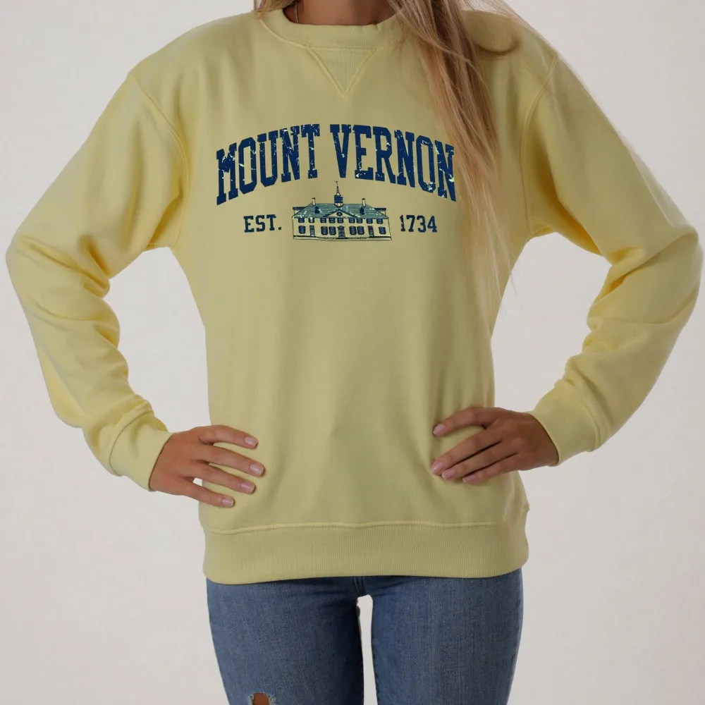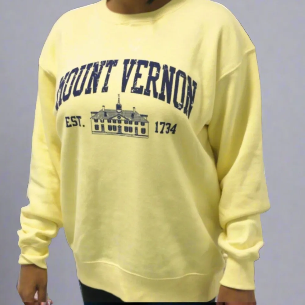 Cozy up or dress down with this quintessential Mount Vernon long sleeve sweatshirt. Design features a distressed text and MV mansion graphic on a extra-soft and plush knit fabric.