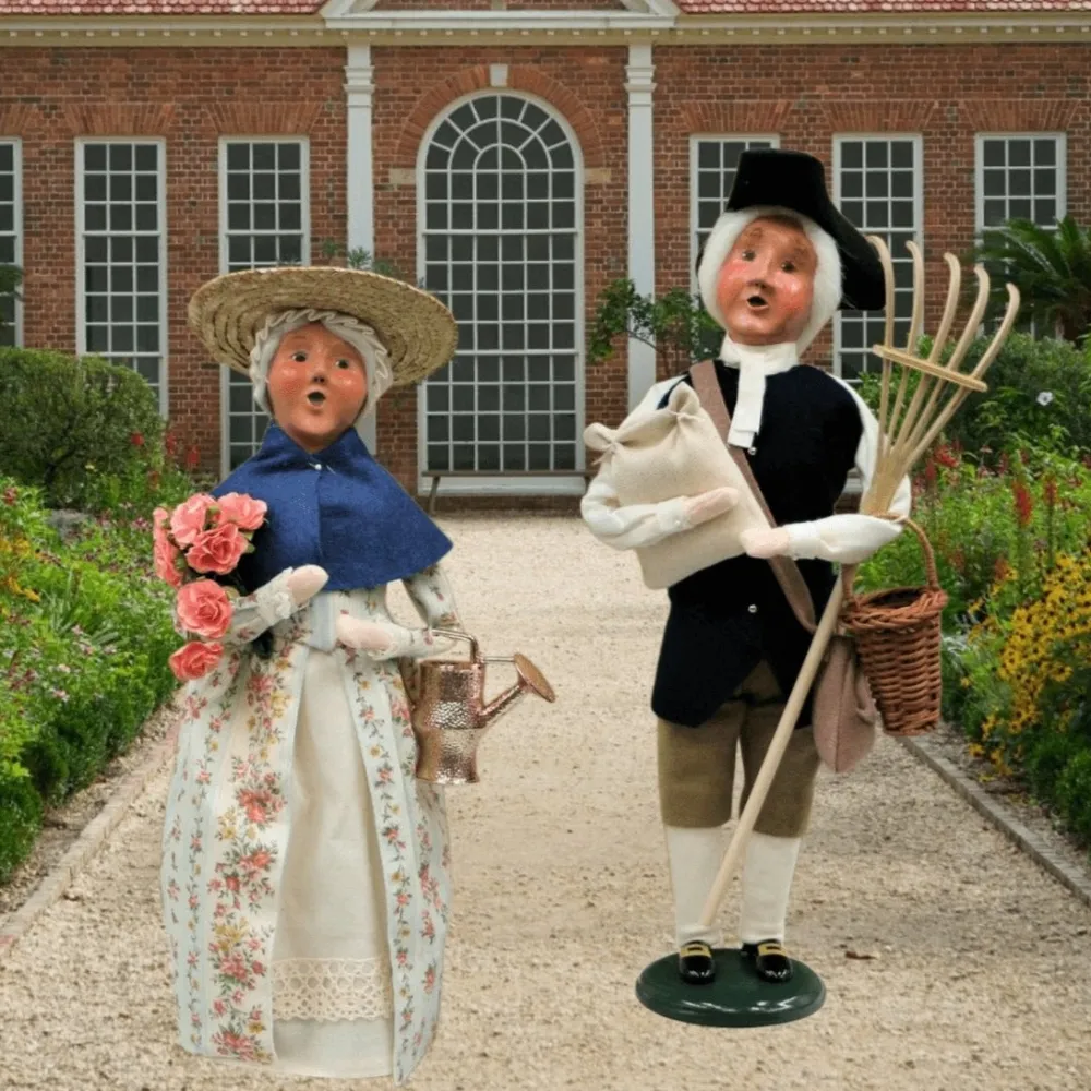This handcrafted Byers’ Choice figure is dressed in a multicolored colonial-style cotton gown with a blue felt mini cape. A delicate mob cap—historically worn to keep dust out of the hair—is tucked beneath her wide straw hat, completing her look as a proper colonial gardener.