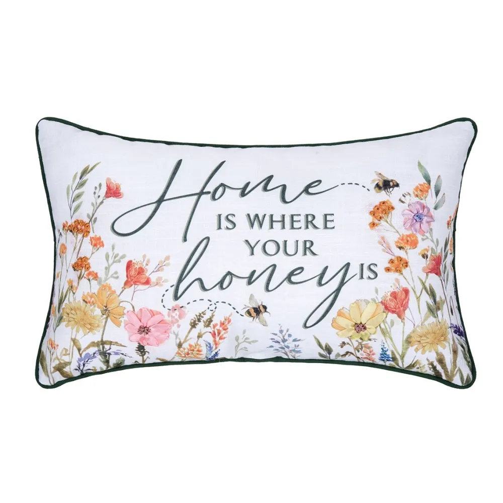 This pillow is a charming blend of bright florals and whimsical bees on a pristine white background. Crafted from 100% polyester, it offers comfort and style in a compact 3″Dx20″Lx12″W size. Featuring an endearing inscription, “Home is where your honey is,” it adds warmth to any space. Easy to maintain with spot cleaning. Perfect for couches, beds, or cozy corners, it brings a touch of sweetness to every room.