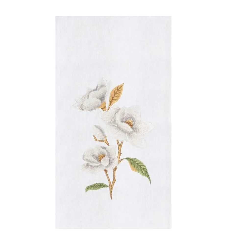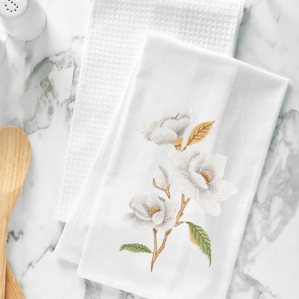 This flour sack towel features a beautifully embroidered magnolia, adding a classic and elegant touch to your home. Perfect for everyday use or special gatherings, it also makes a thoughtful gift for any occasion.