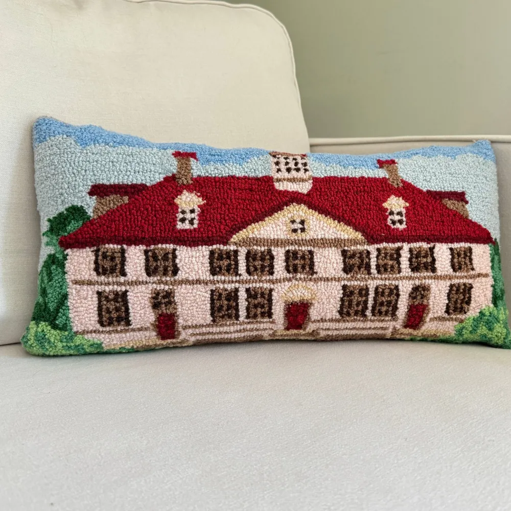 Add a touch of history and elegance to your home with this exclusive 12×24″ Mount Vernon Pillow. Featuring a beautifully hooked design of the iconic Mount Vernon mansion against a serene blue sky, this pillow brings a sense of timeless charm to any room. Crafted with attention to detail, the pillow showcases the grandeur of George Washington’s beloved home.
