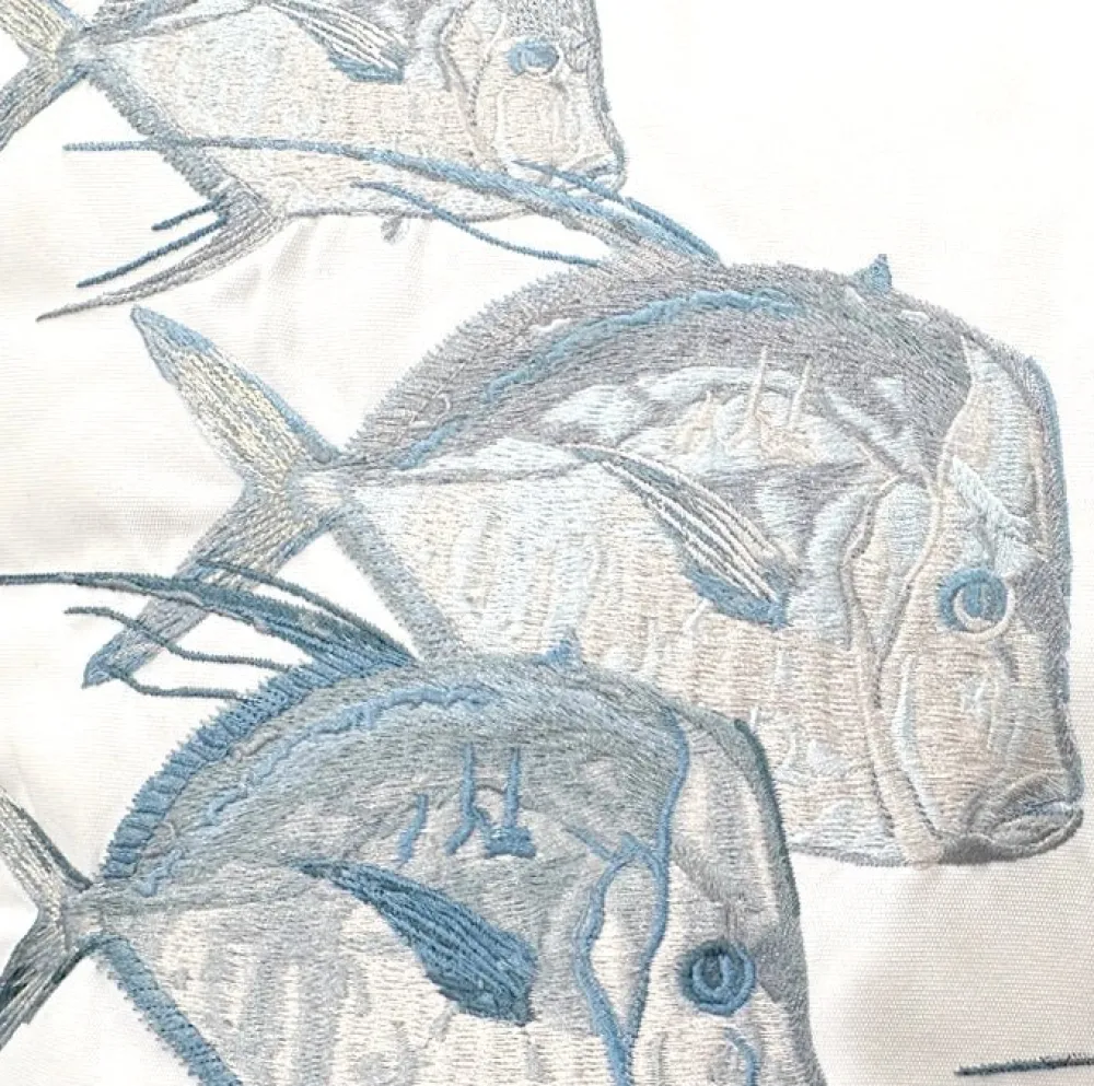 Bring the serenity of the sea into your home with this beautifully embroidered pillow, featuring a school of graceful lookdown fish in soothing sea glass hues. Designed for both indoor and outdoor spaces, this pillow captures the fluid elegance of ocean life while offering durability and style.