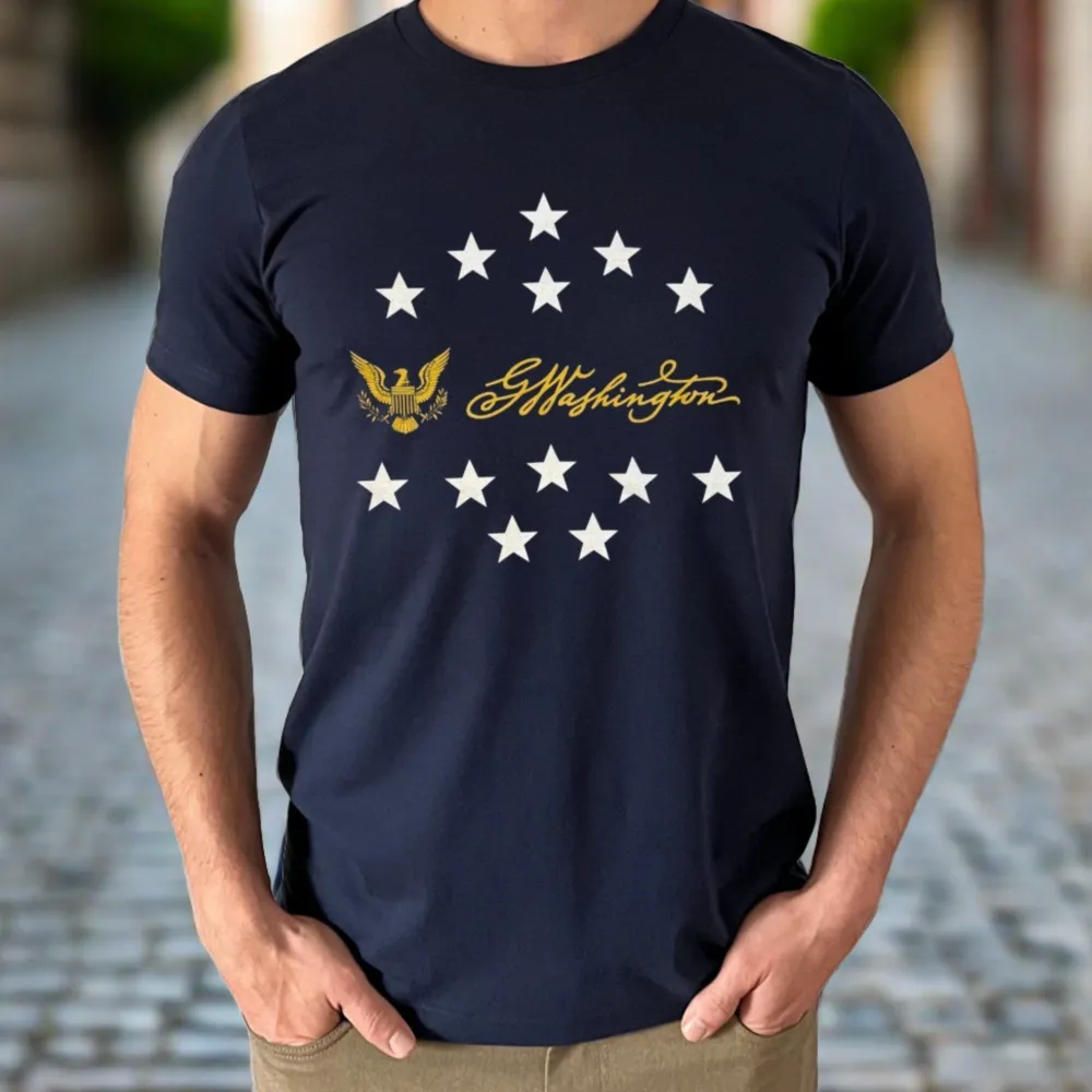 Celebrate American heritage with our Mount Vernon Exclusive Navy T-shirt, a timeless tribute to the nation’s history. Featuring George Washington’s signature, 13 stars symbolizing the original colonies, and the iconic Presidential Eagle Emblem, this shirt proudly embodies the spirit of patriotism and America’s founding.