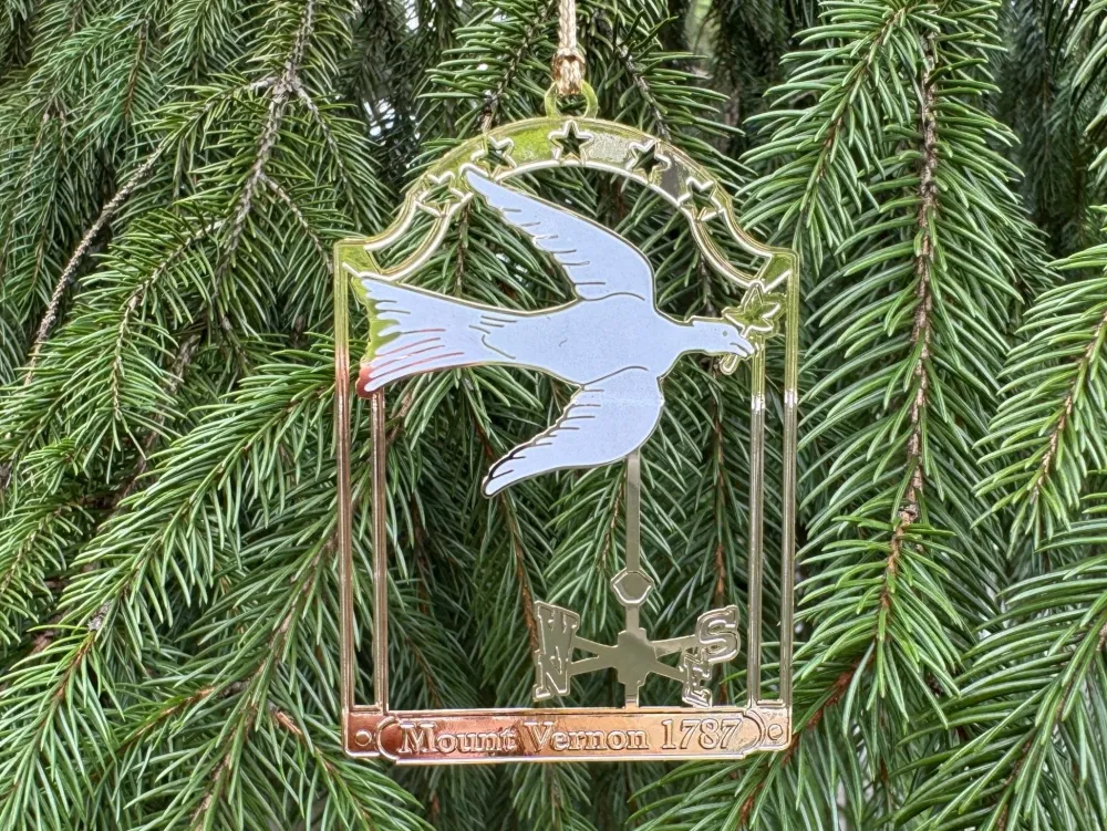 Celebrate history with this exquisite gold tone metal ornament, showcasing the iconic Dove of Peace weathervane that crowns Mount Vernon. Meticulously crafted, the ornament bears the inscription “Mount Vernon 1787,” commemorating the legacy of George Washington’s beloved estate. Hanging elegantly from gold twine, this piece is a timeless addition to your holiday décor, symbolizing peace and the enduring spirit of America.