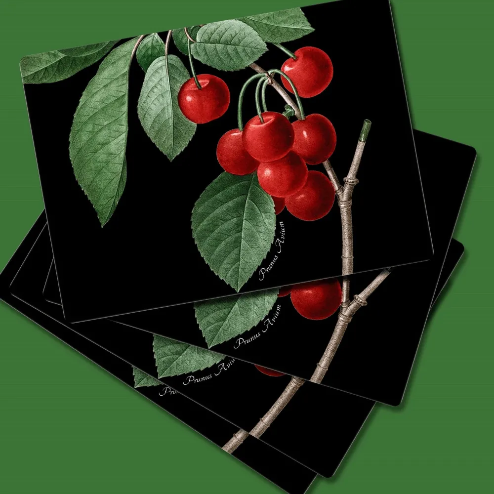 A brightly colored sprig of cherries comes to life on our hardboard placemats with dark background. Fruit trees were integral to Washington’s garden designs and beautiful cherry trees still bloom in the gardens at Mount Vernon. Cherries are a colorful design choice for table and household items offered in the Shops.Â