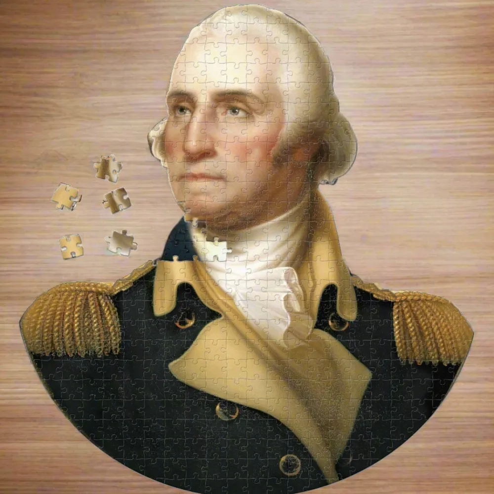 Beautiful keepsake puzzle of the Porthole Portrait of GW by Rembrandt Peale, circa 1823. This is one of 79 portraits that Peale painted throughout his life, some depicting Washington in military uniform as shown, others in civilian dress. The portrait is based on Peale’s study of Washington done from life in 1795, when the artist was 17 and the retired General and President was 63 years old.