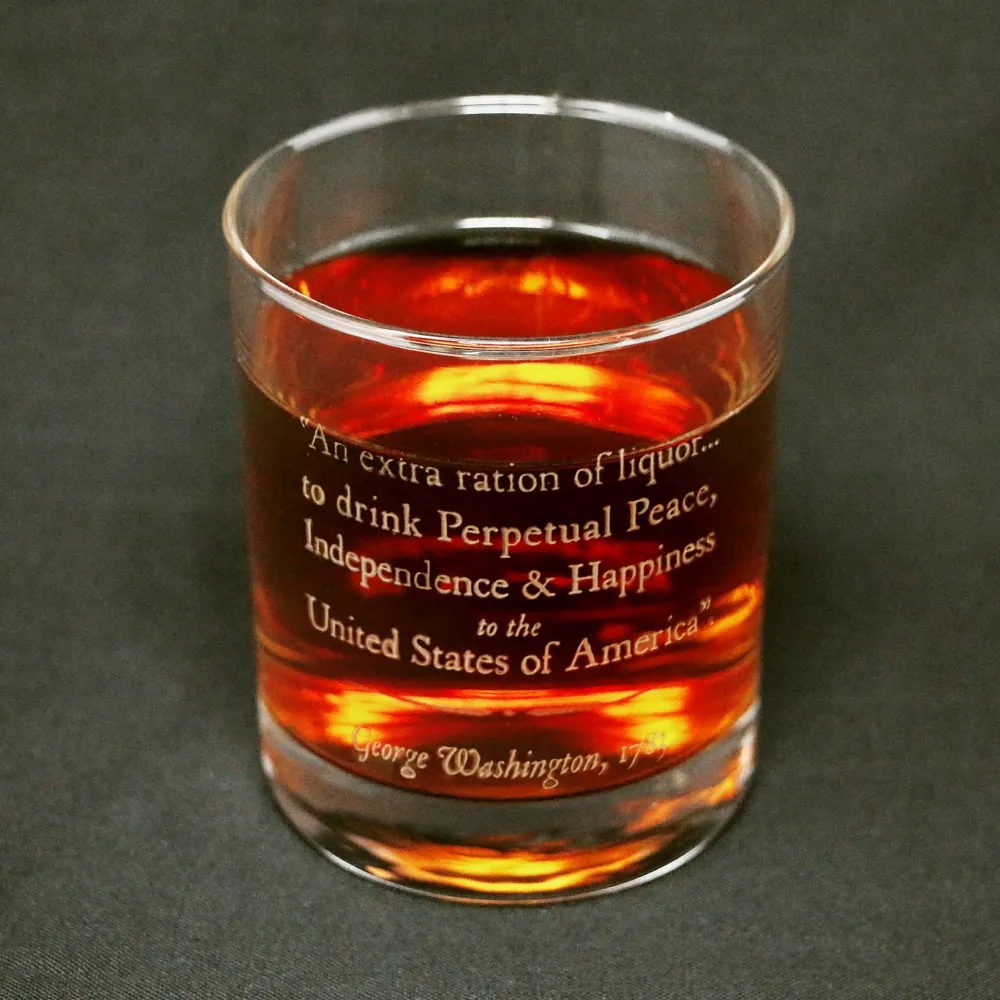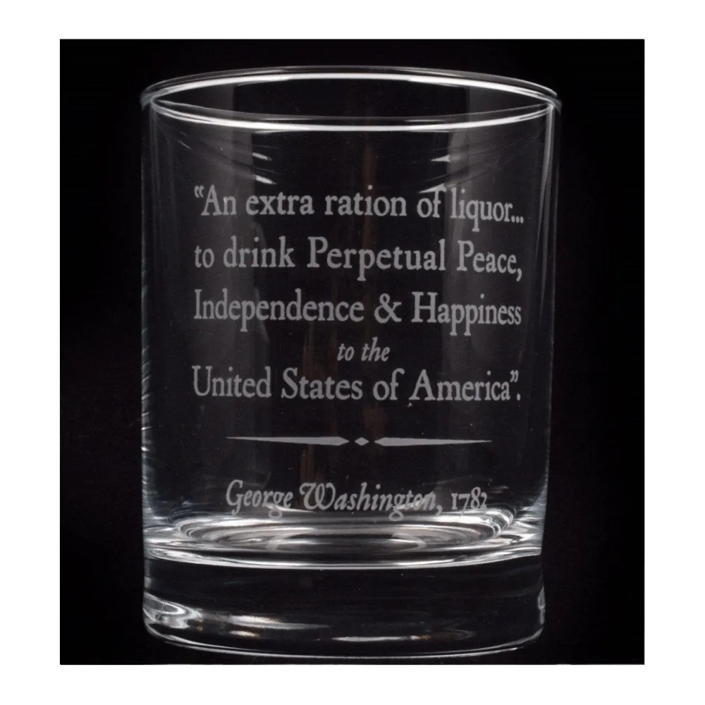 An abbreviated 1783 quote from Washington is etched on one side of this sturdy whiskey glass. The full original quote read “An extra ration of liquor to be issued to every man tomorrow, to drink Perpetual Peace, Independence & Happiness to the United States of America.” Cheers to that!