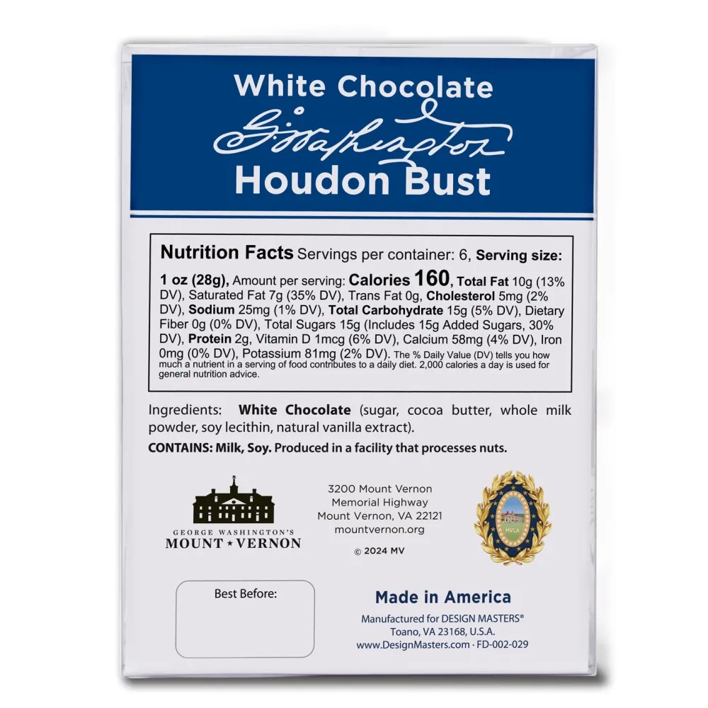 Honor George Washington with this beautifully crafted 6.5 oz. white chocolate bust, inspired by the renowned Houdon Bust from Mount Vernon. Made in the USA, this delicious piece of art captures the detailed likeness of America’s first president. A Mount Vernon exclusive, it makes the perfect gift or a sweet way to enjoy a piece of history.