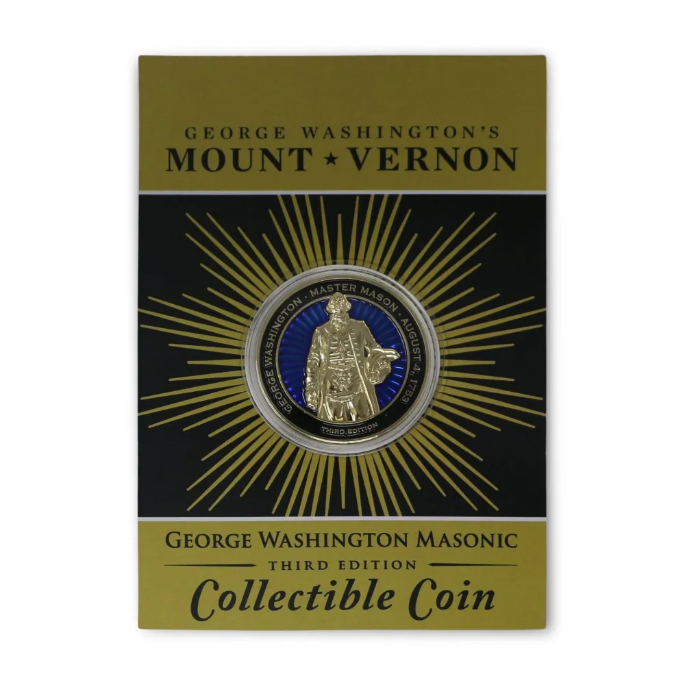 This gold, blue and black 1 ¾” commemorative coin is inscribed on one side with “George Washington Master Mason August 4, 1753 – Third Edition.” The flip side features the masonry insignia and inscription “The Brotherhood of Man – The Fatherhood of God.”