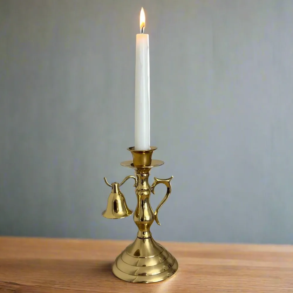 Our solid brass candlestick adds a flicker of candlelight and the sophistication of 18th century design. This 7″ tall solid brass candlestick has a thumb grip handle for ease of carrying as well as a convenient, removable snuffer to extinguish a candle’s flame. The highly polished brass has been lacquered to retain a shiny finish.Â