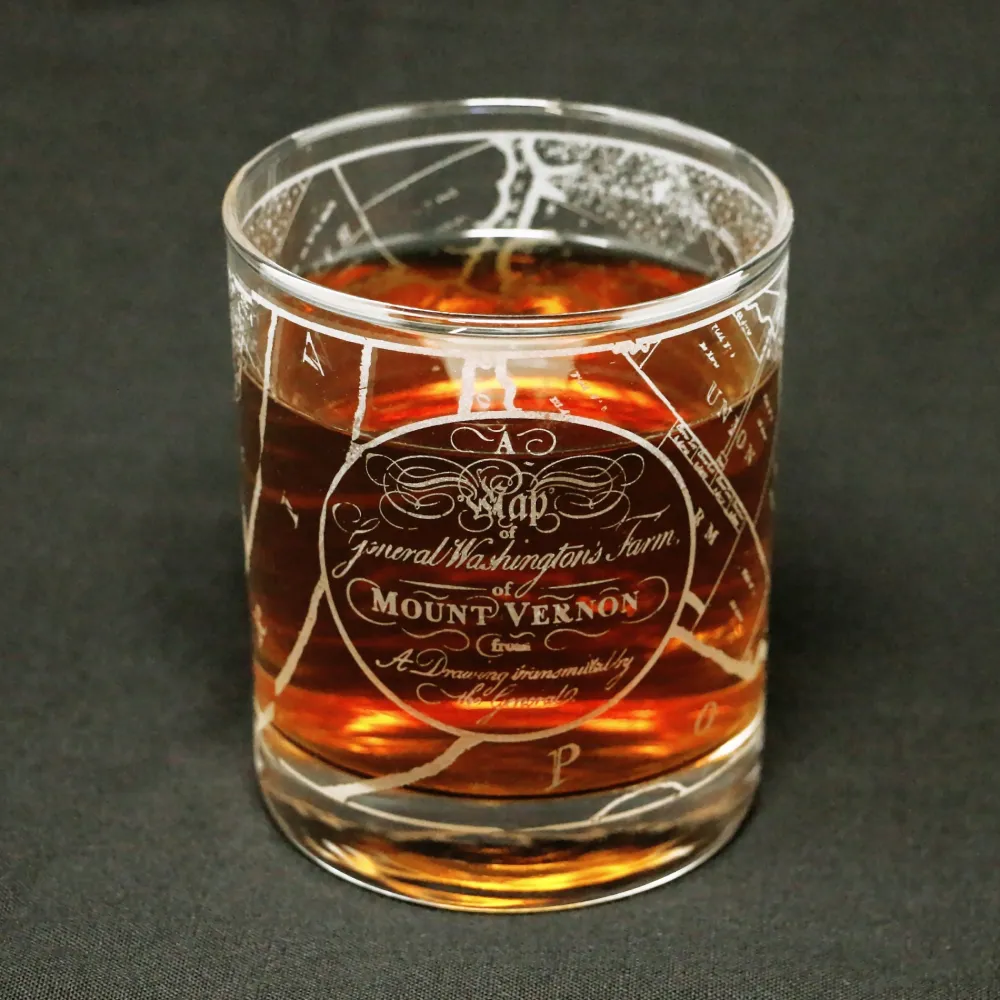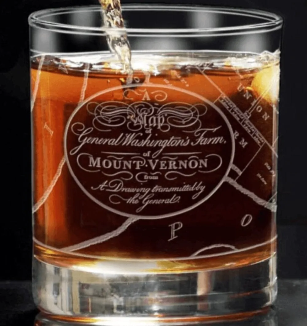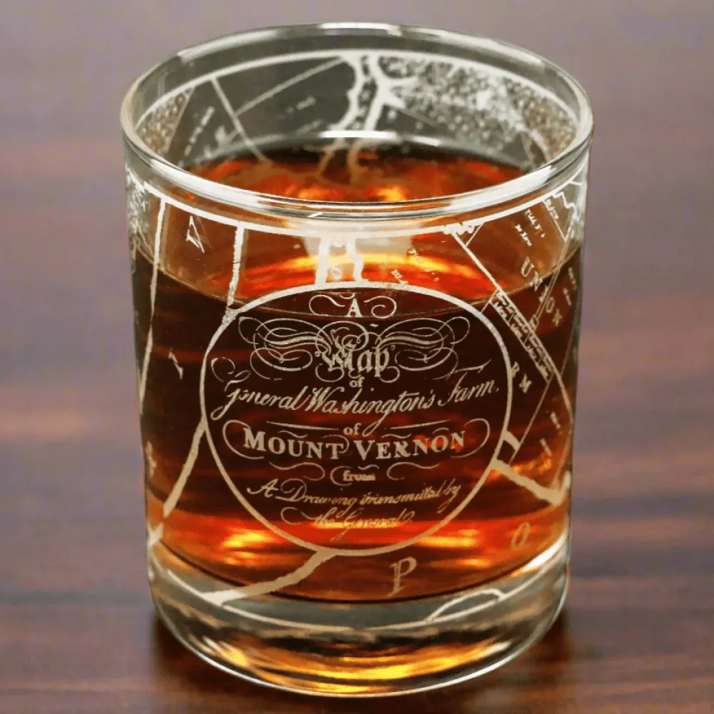 A map drawing of Washington’s farm is etched all around this sturdy whiskey glass.