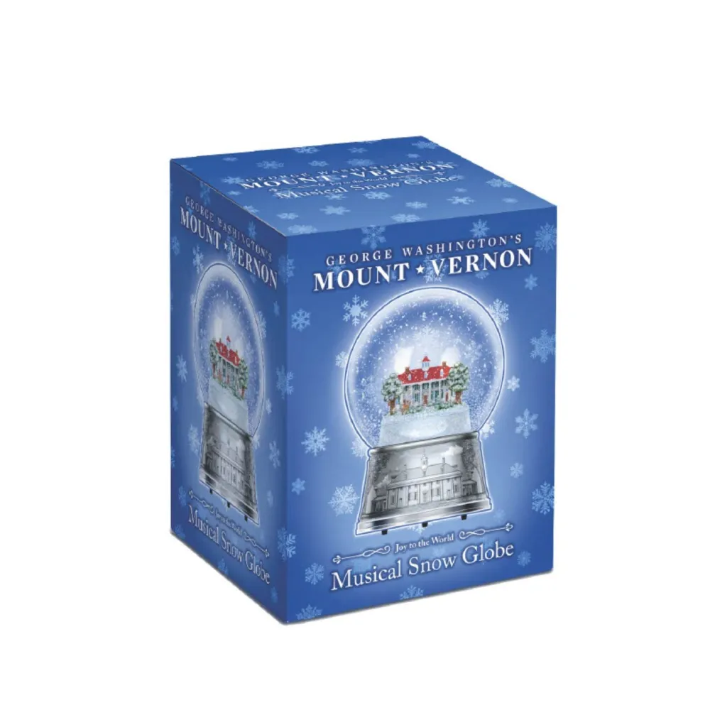 This large snow globe is 6 ½” tall overall including its metallic base, which is approximately in 4 ½ diameter. The globe is filled with filled with iridescent, glittering snow, and a colorful scene of the Mount Vernon Mansion.Â