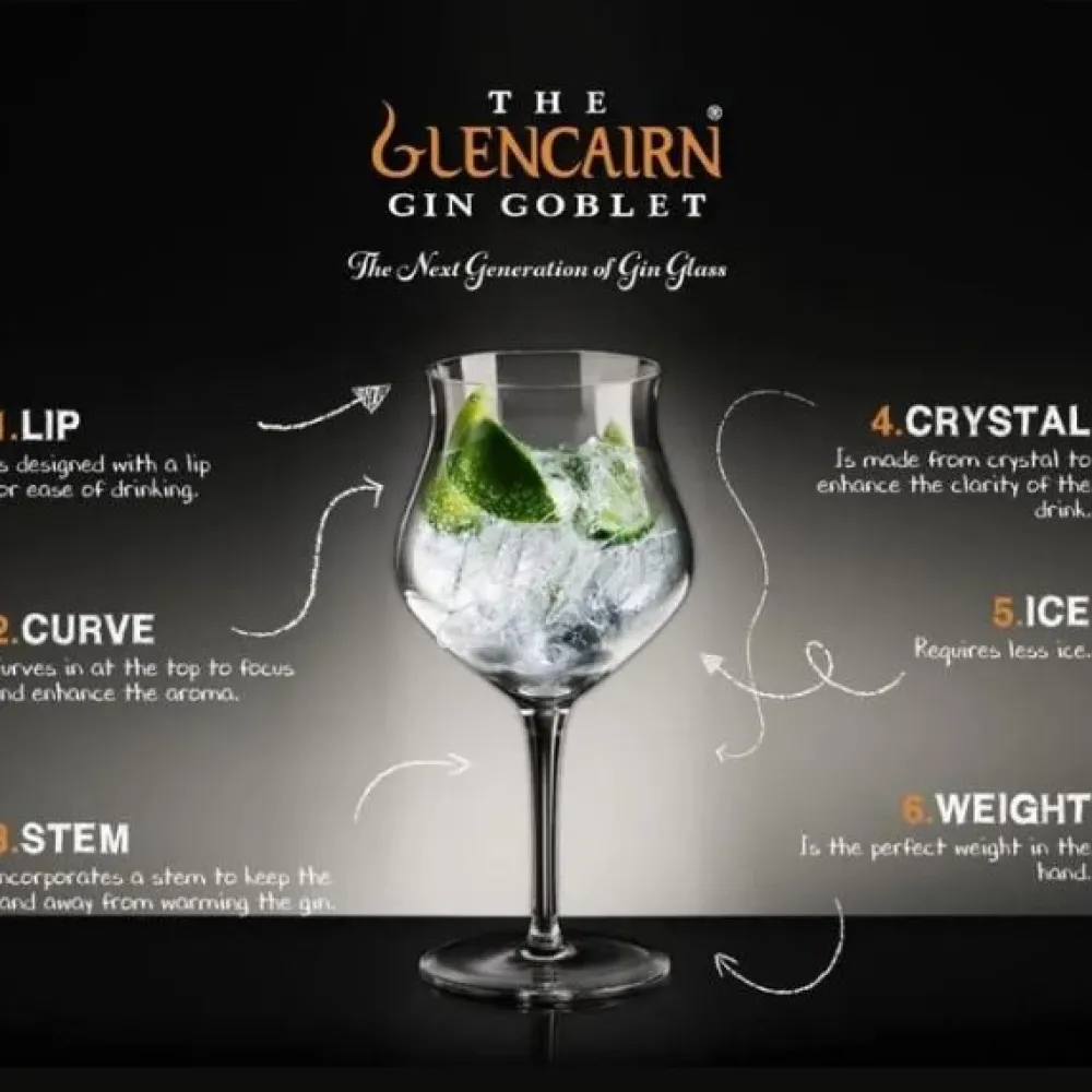 The Glencairn Gin Goblet is designed to enrich your drinking experience with its lip and curve feature for aroma enhancement and, most importantly, drinking ease – no more drinks and ice spilling down your chin! Use with Gin, Wine or any other beverage of your choice.