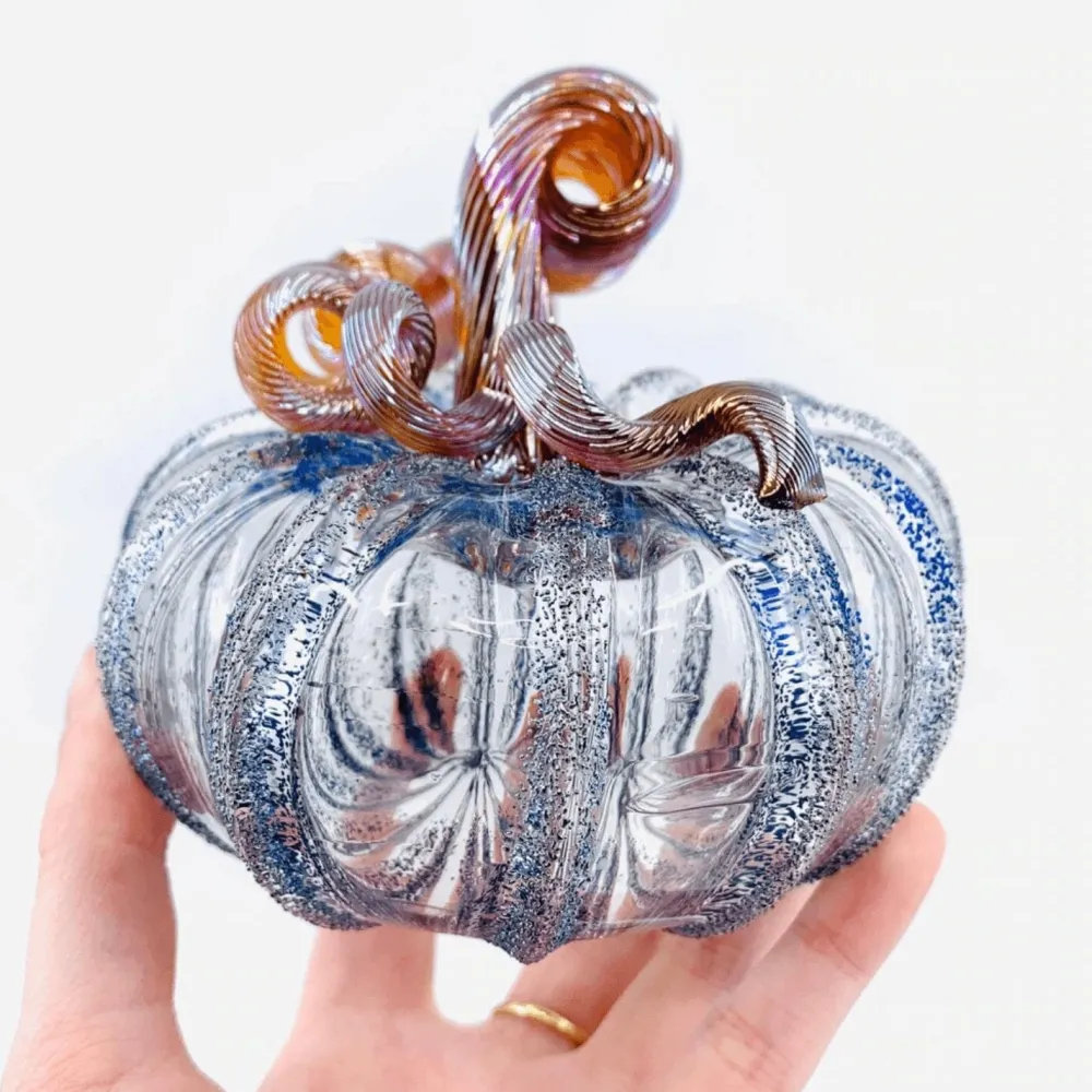 Magical fairy-tale inspired glass pumpkins are reminiscent of Cinderella’s famous pumpkin coach and glass slippers. Delicate metallic glass is sprinkled over the ridges of each pumpkin so they sparkle with silver frost. The Happily Ever After Pumpkins sparkle in bright and blue tones for amazing centerpieces in winter decorating schemes or any other occasions. Hand blown by master glass maker Luke Adams.