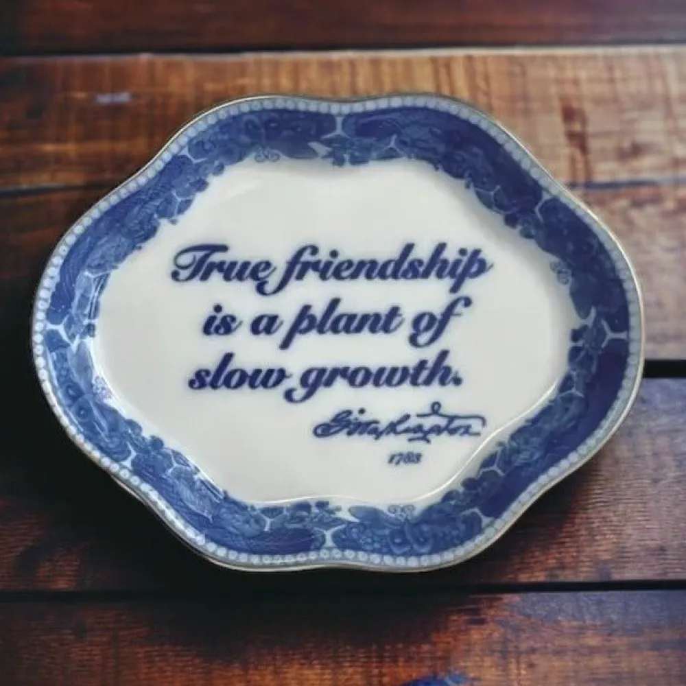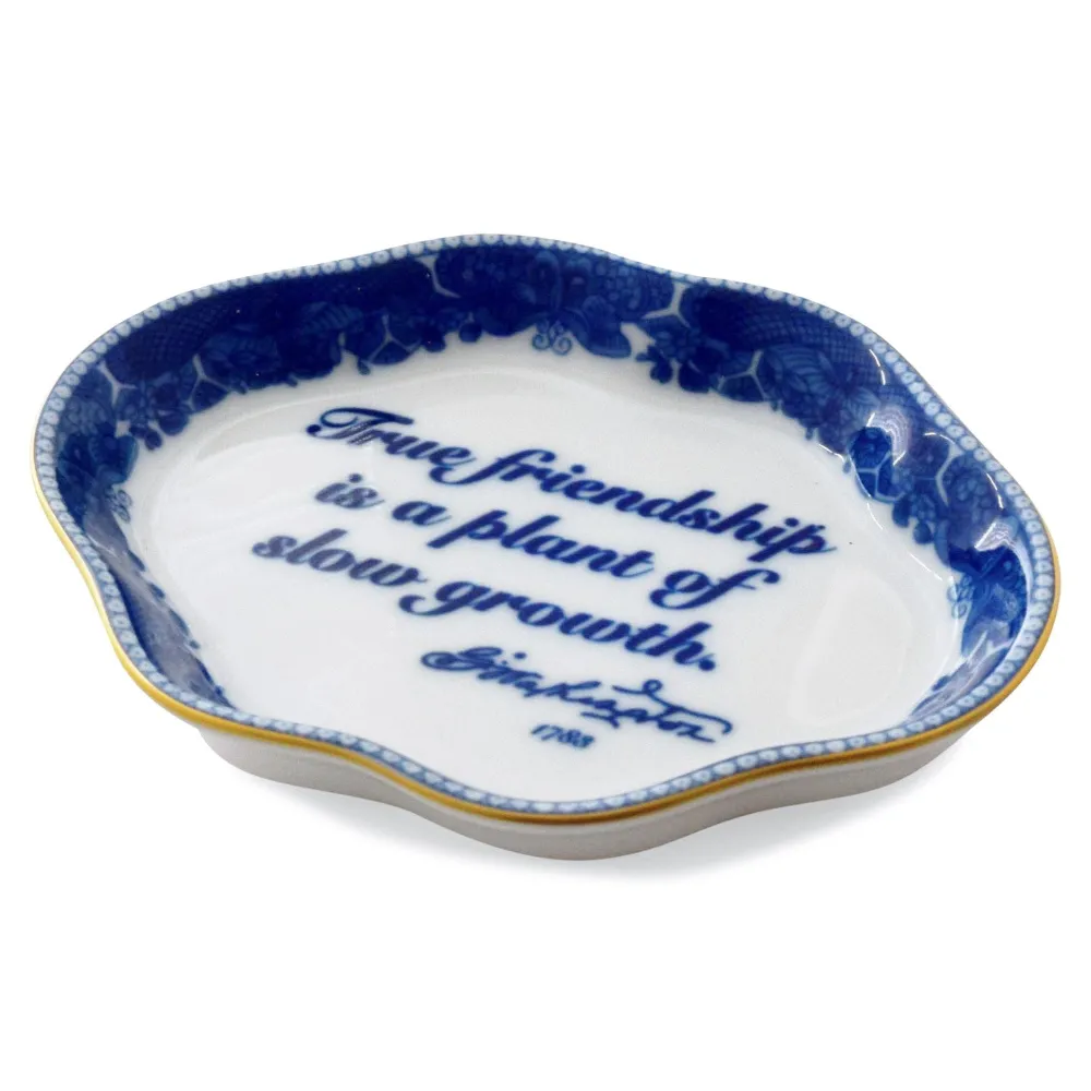 This small dish is a reproduction of George Washington’s most famous set of china. Made by Mottahedeh, this dish has one of Washington’s quotes, “True friendship is a plant of slow growth.” George Washington’s signature is also evident on the dish along with the year 1783.