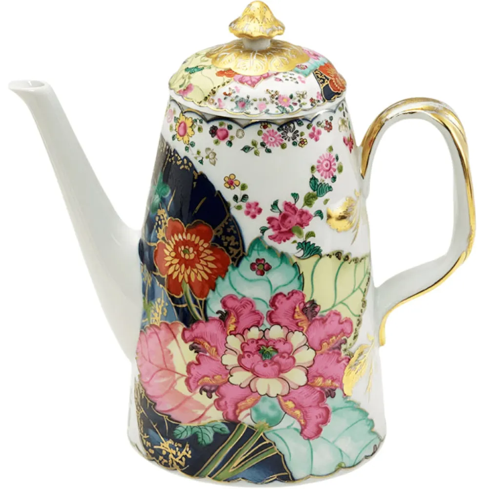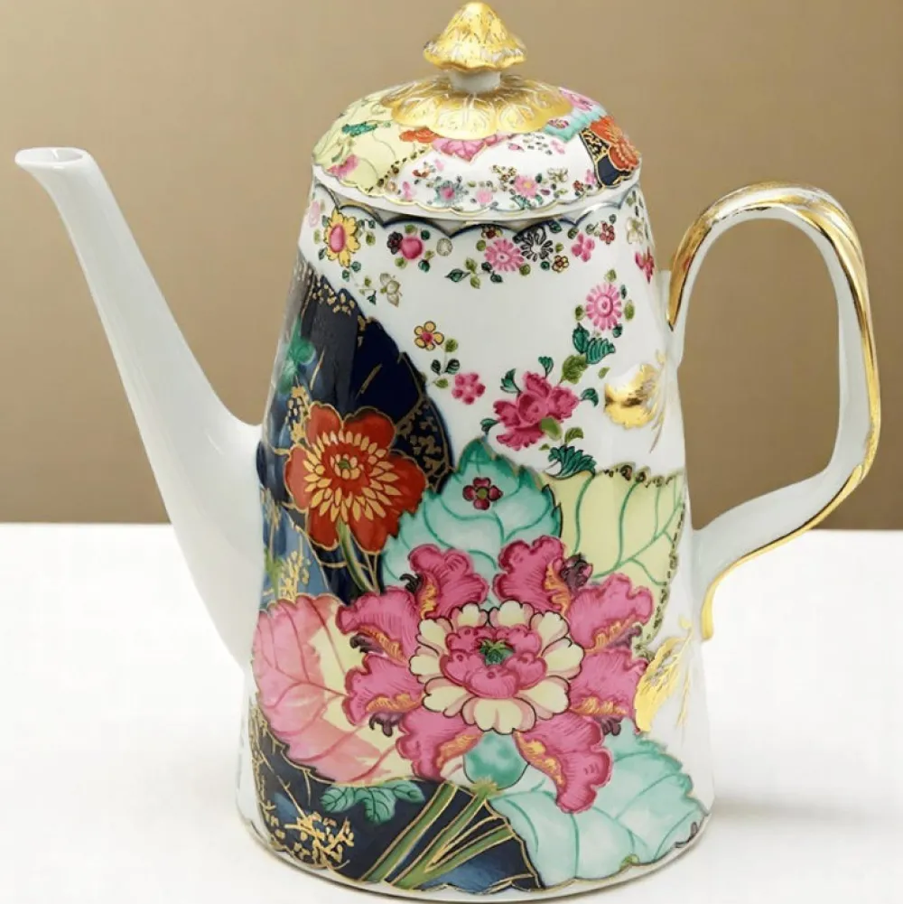 This extraordinary Tobacco Leaf Coffeepot is a reproduction of one of the most highly prized 18th-century dinnerware patterns. Originally crafted in China, likely for export to the Portuguese and Brazilian markets, this design was cherished for its elegance and intricate beauty. George and Martha Washington owned pieces of this pattern, and examples can be found in the Mount Vernon collection.