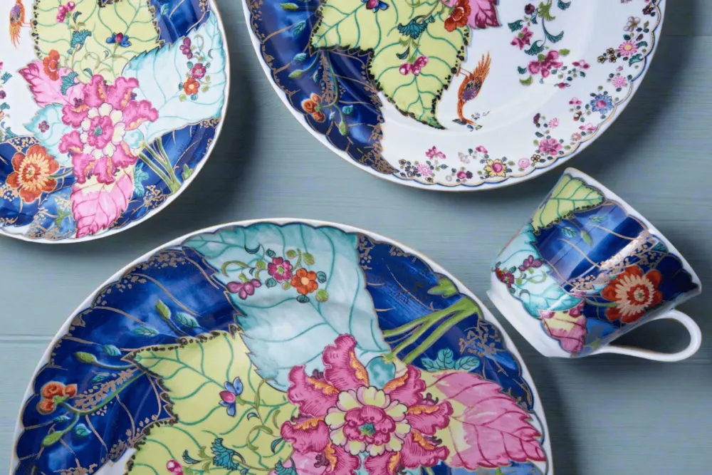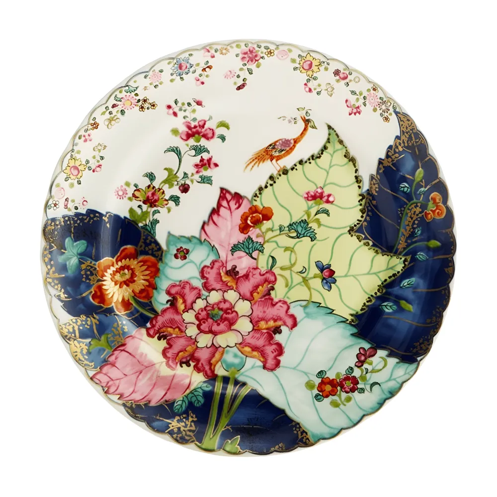 A small phoenix bird perches on the leaves of the flowering Nocotiana (Tobacco) plant. Twenty-seven colors with 22k gold characterize this pattern which is based on an original which is displayed in the Metropolitan Museum of Art.