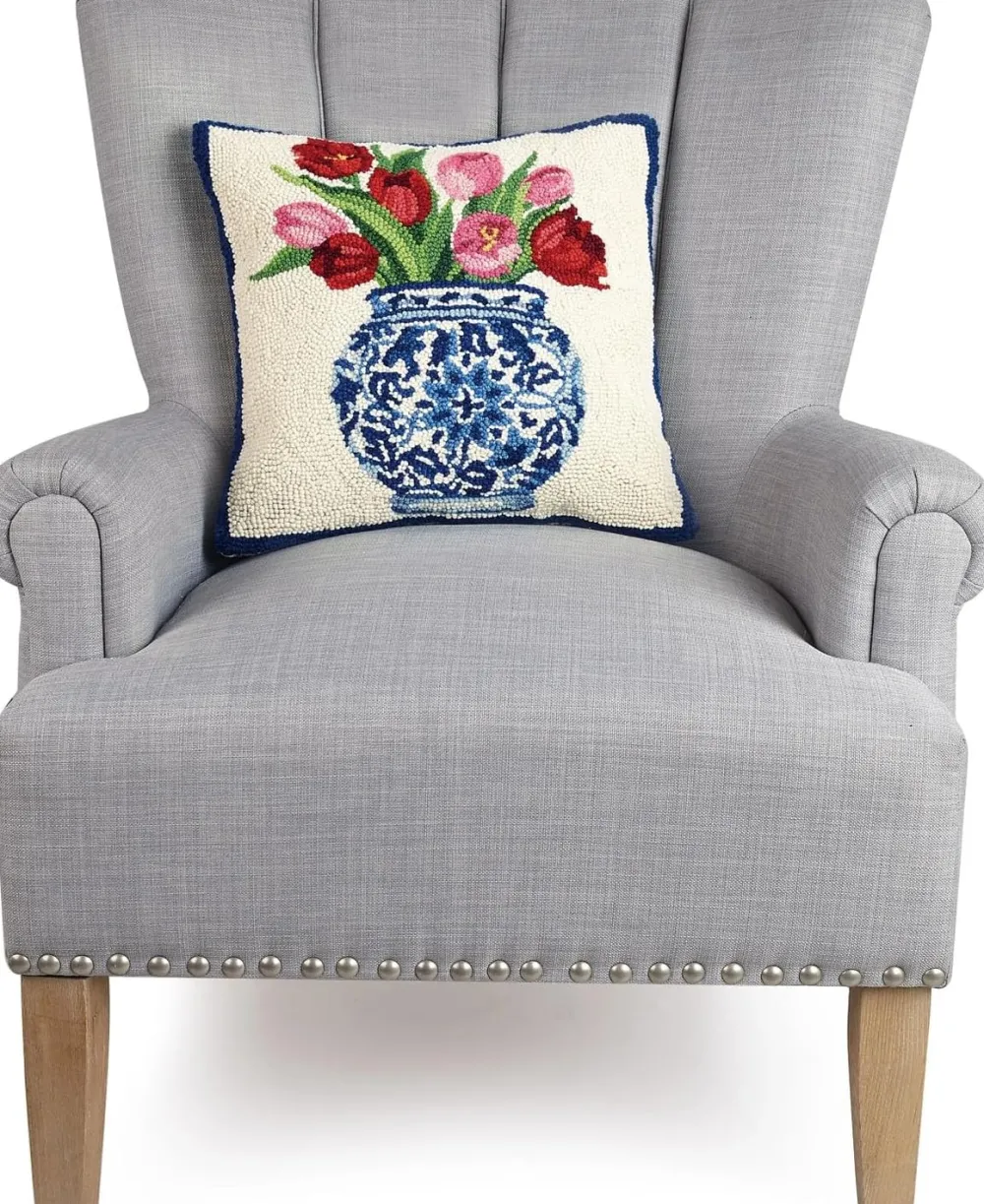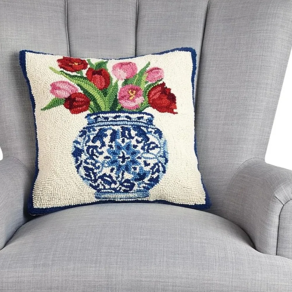 Indulge in timeless elegance with this hooked wool throw pillow by Sally Eckman Roberts. Adorned with a charming chinoiserie vase filled with red tulips, it adds warmth and beauty to any room. Crafted with a 100% wool face and polyester velveteen back, it’s both luxurious and versatile. Measuring 16 inches square, it’s perfect for sofas or beds. Spot clean for easy care.