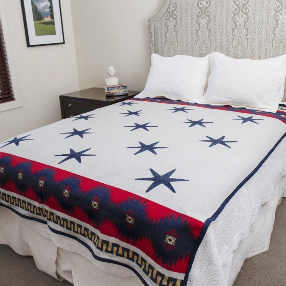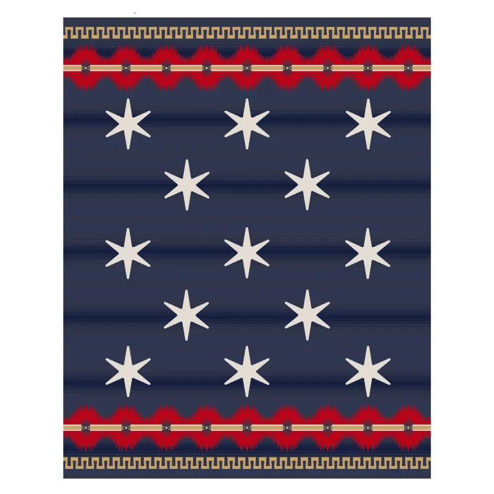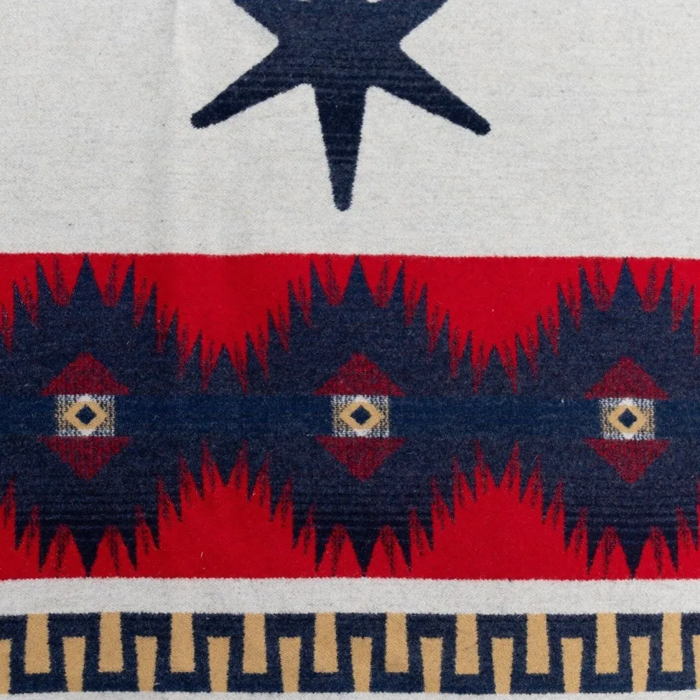 This custom Pendleton blanket exclusively created for Mount Vernon honors George Washington’s service as America’s first Commander in Chief. The design was inspired by the Commander-in-Chief flag, also known as George Washington’s Headquarters Flag. It is believed that Washington designed the flag, which features a blue field with thirteen six-pointed stars. Thought to be the earliest surviving thirteen-star American flag, it dates to about 1777-1783. Within the red border, arrowheads honor Washington’s important relationship with Native American tribes and leaders. The gold and blue dentil cornice is inspired by architectural details at George Washington’s home, Mount Vernon.