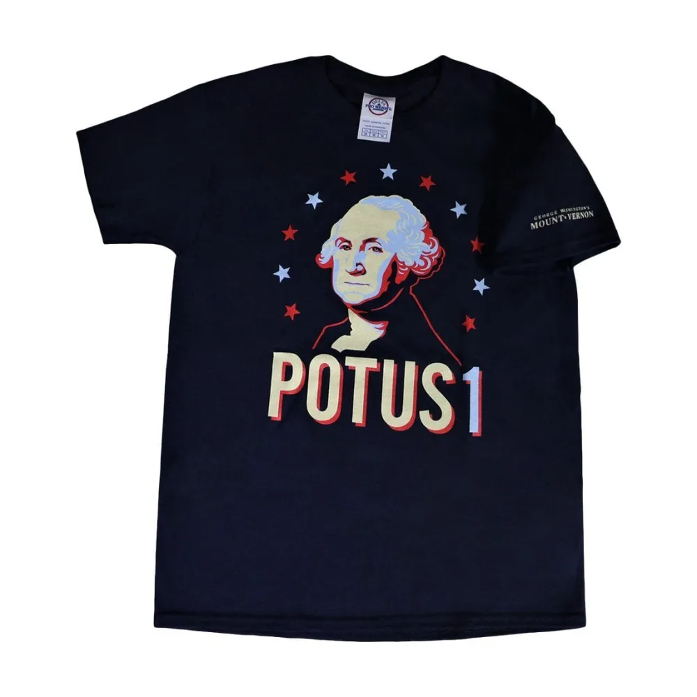 Show your support of America’s first president with this POTUS 1 shirt. This navy short-sleeved t-shirt has a patriotic red, blue and beige illustration of Washington with “POTUS 1” underneath and star accents above. “George Washington’s Mount Vernon” is printed on the sleeve.