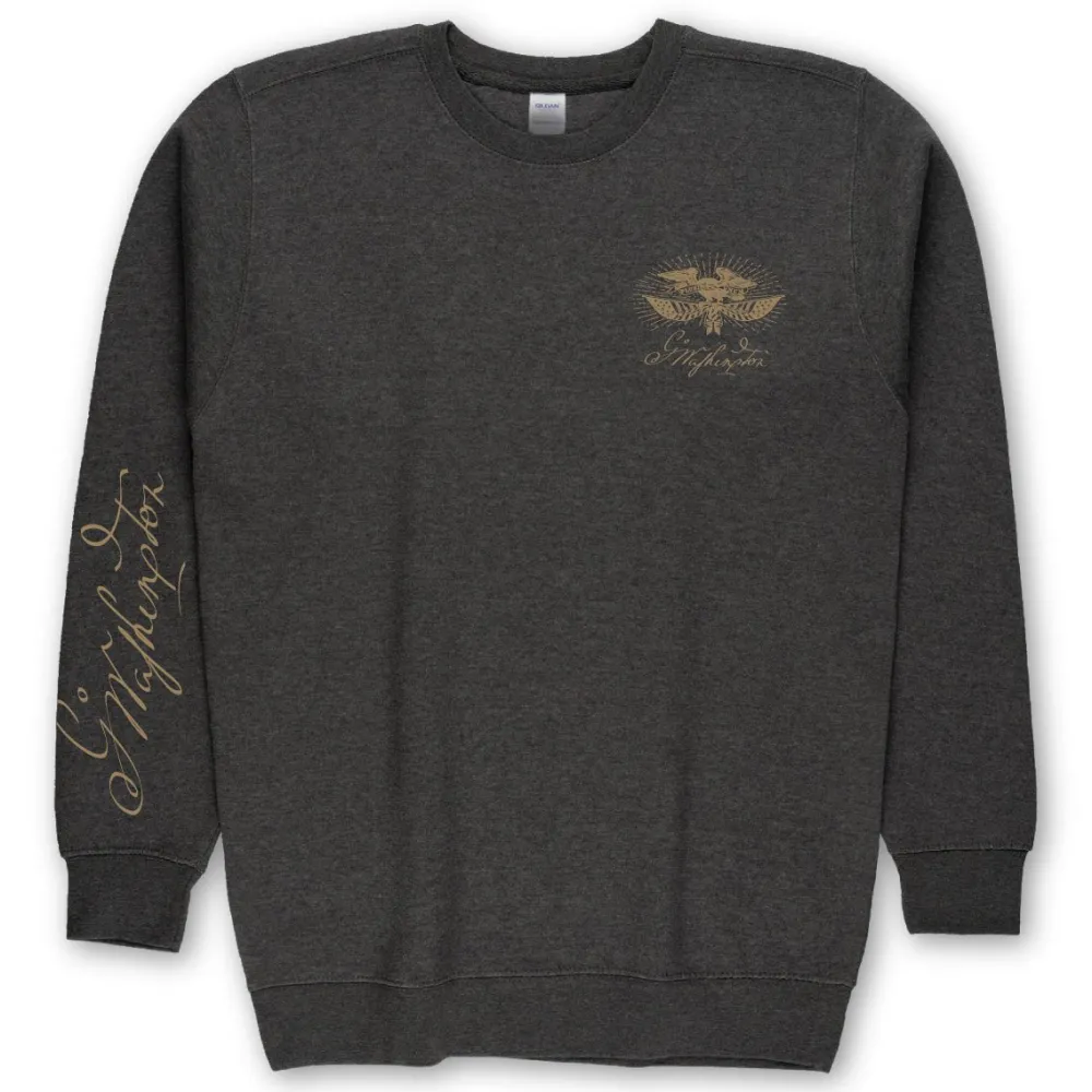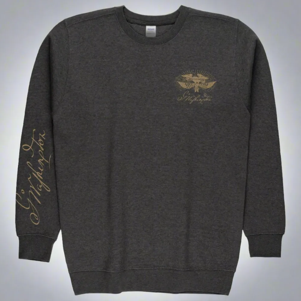 Introducing our Heathered Black Sweatshirt, a perfect blend of comfort and style for any occasion. This cozy sweatshirt features a striking eagle emblem on the chest, with George Washington’s replica signature elegantly placed below it. For an extra touch of historical charm, a larger replica of Washington’s signature adorns the sleeve.