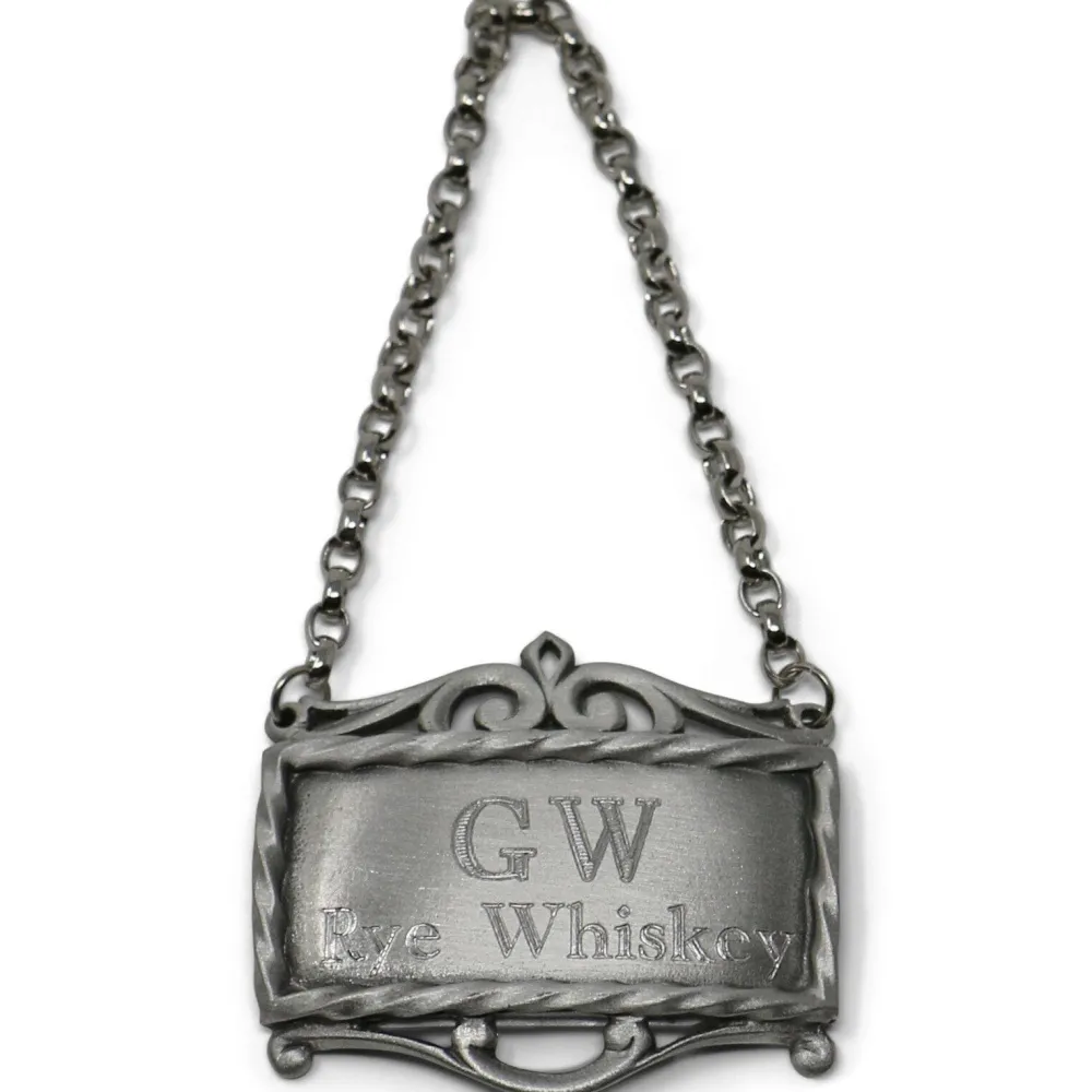 Enhance any bar with this elegant GW Rye Whiskey pewter decanter label, designed to bring historical flair to your collection. This label loops easily onto most decanters or a George Washington Rye Whiskey bottle, paying homage to George Washington, once the largest whiskey producer in America.