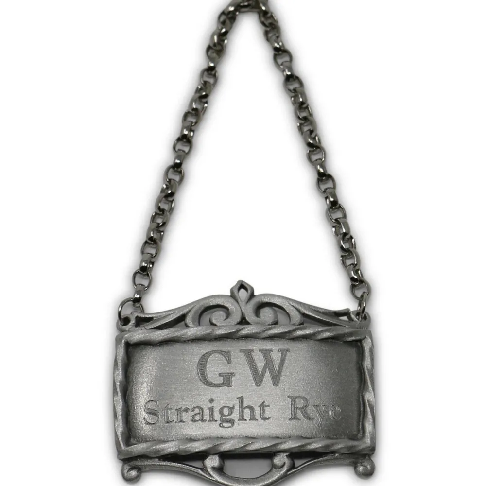 “GW Straight Rye” is engraved on this handsome pewter decanter label. Scrollwork surrounds the central portion of the 2″ x 1″ label. The pewter chain is 6″ long. By Salisbury. Made in the USA.