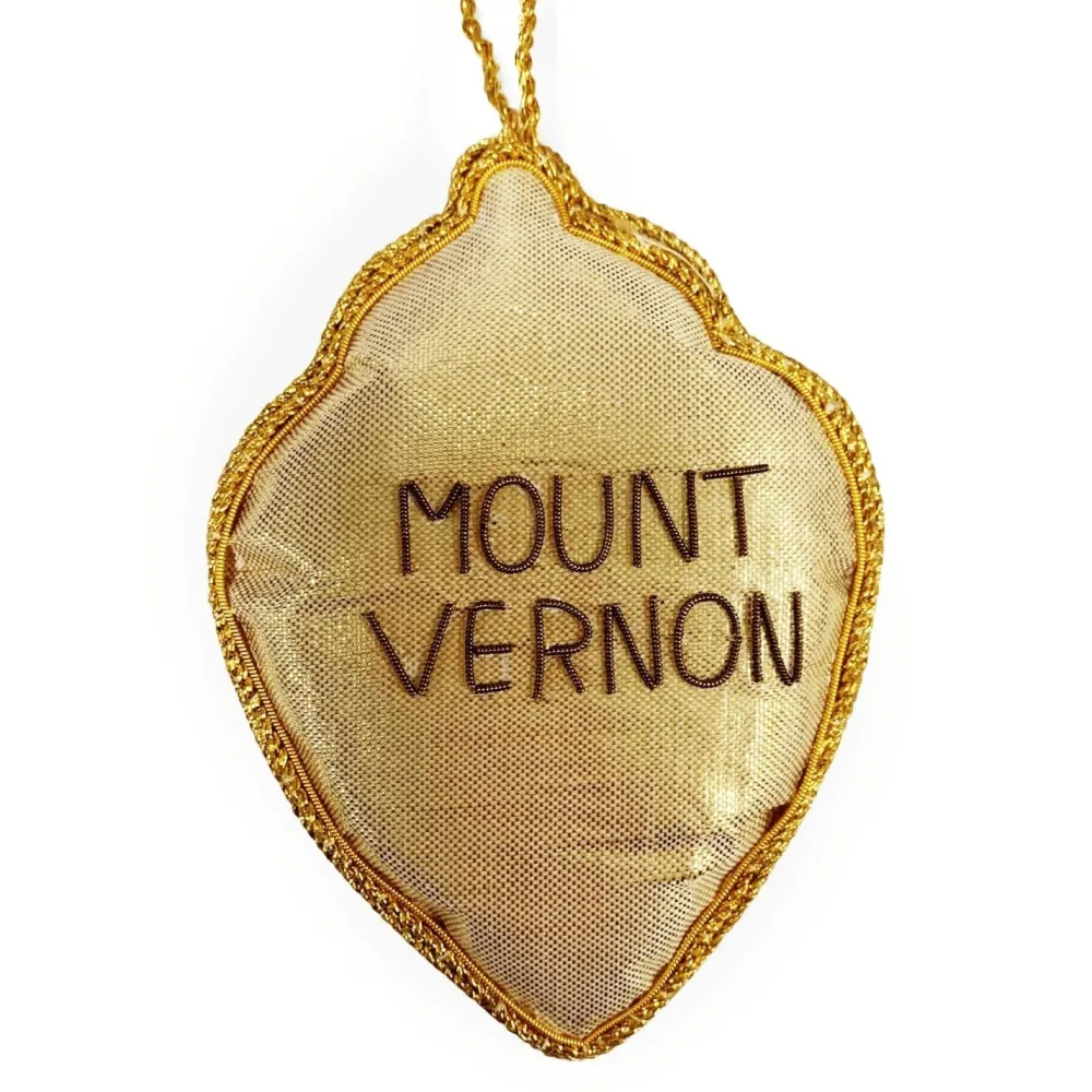 This ornament displays various embedded beads and a gold embroidered trim. “Mount Vernon” is embroidered on the back side and a gold thread allows for easy display. Size is approximately 4 ½” x 3 ½”.