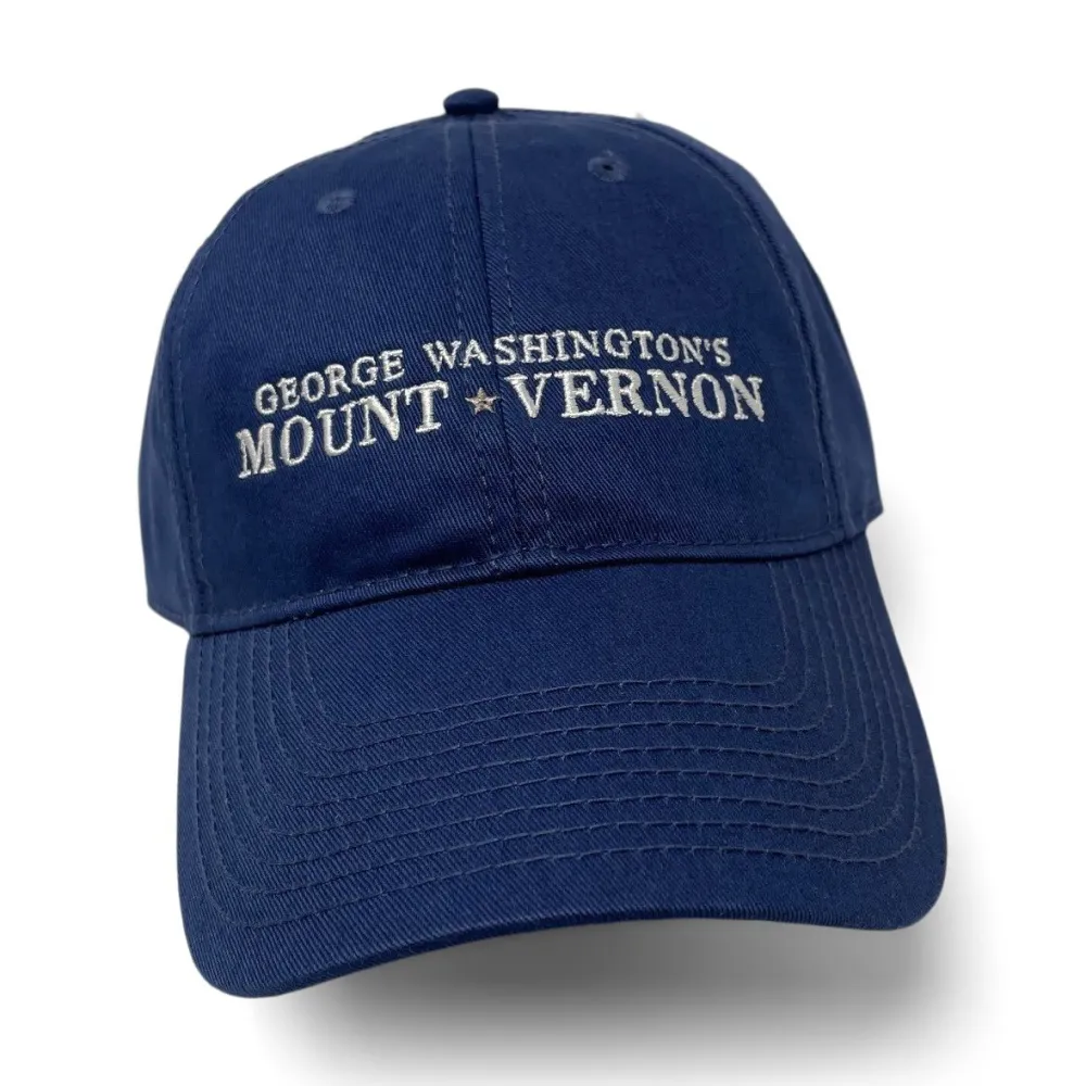 Indigo blue, six-panel, low-profile baseball hat embroidered with George Washington’s Mount Vernon in white on the front side. With an adjustable fabric strap, it is unstructured and has a pre-curved bill.