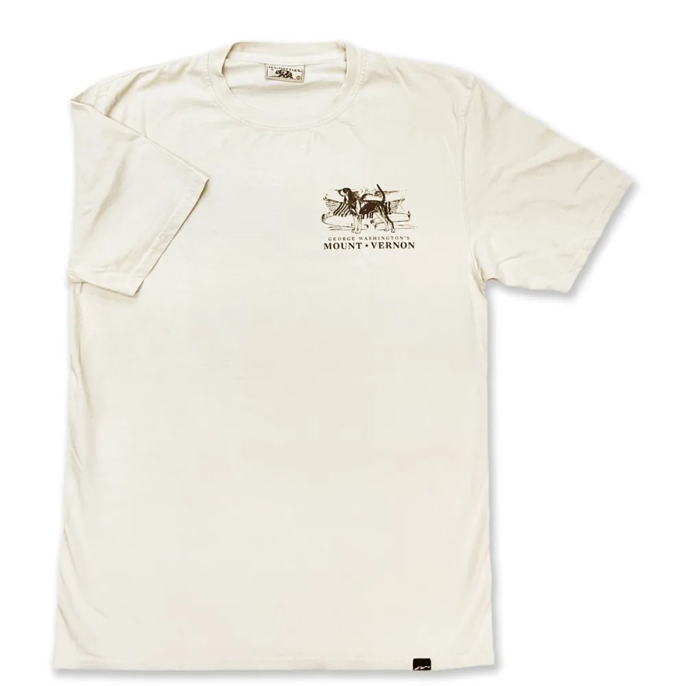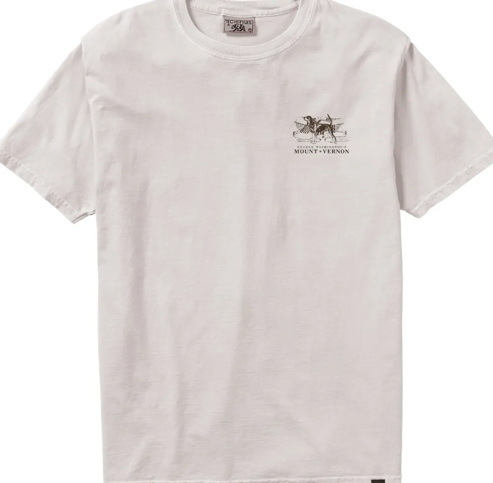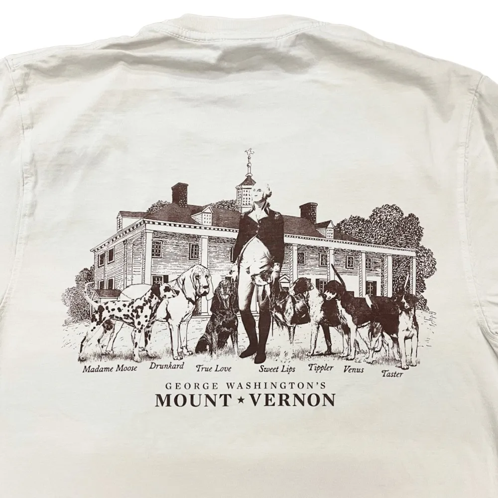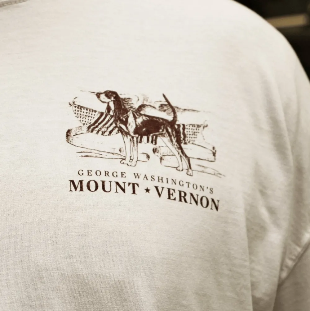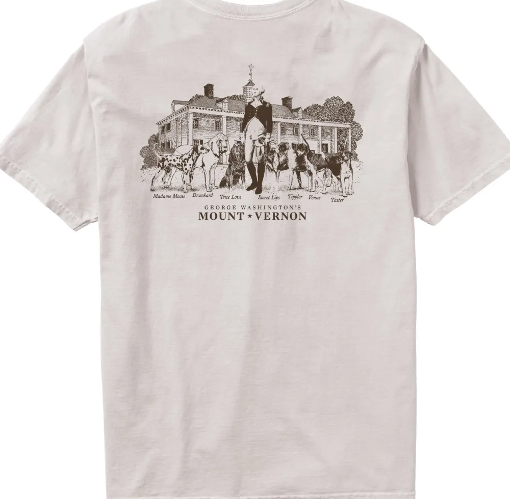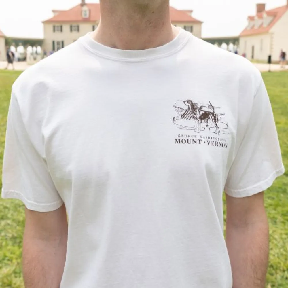 This light-weight cotton t-shirt is perfect for dog lovers and history buffs alike! Front logo represents one of the many hounds found at Mount Vernon during Washington’s time. Design on back displays George Washington standing in front of the mansion surrounded by seven of his beloved dogs: Madame Moose, Drunkard, True Love, Sweet Lips, Tippler, Venus and Taster.