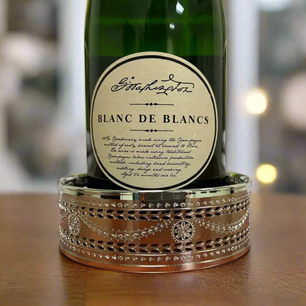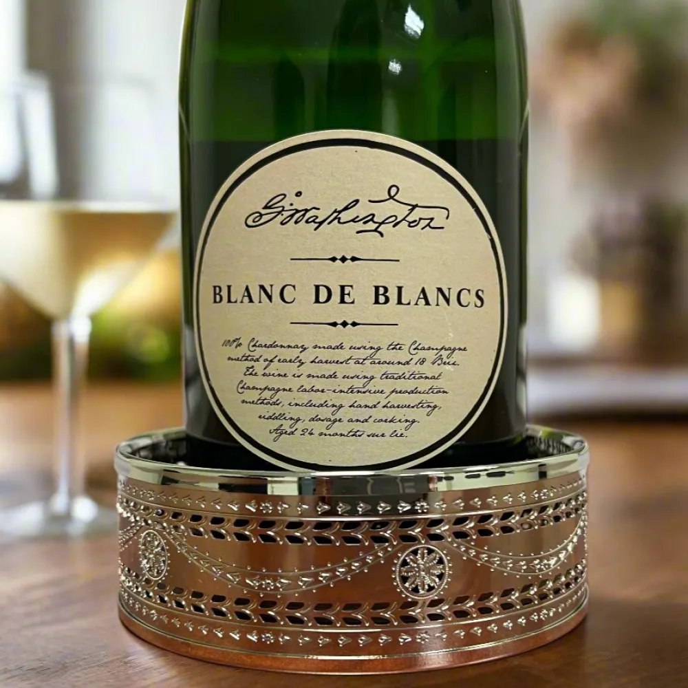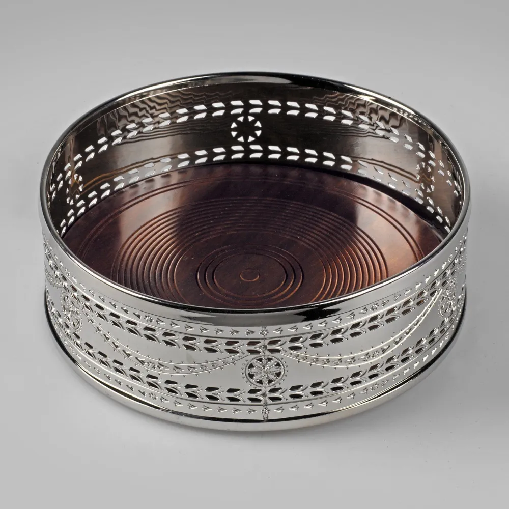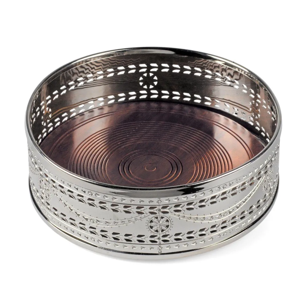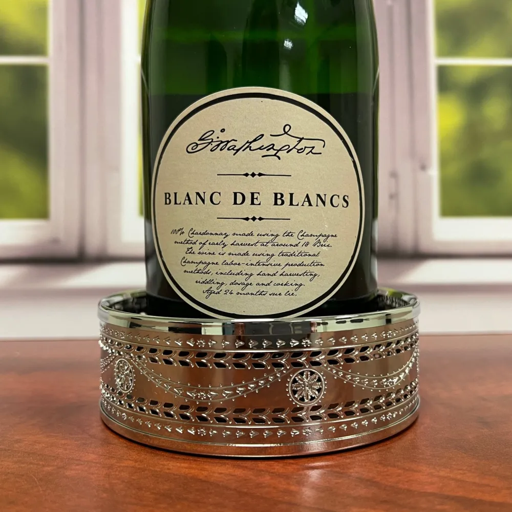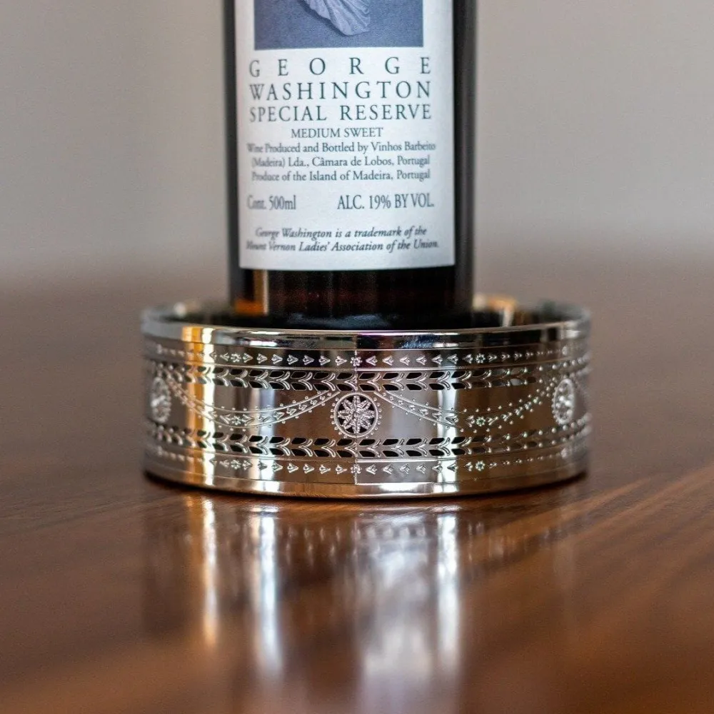 The original bottle slider is the inspiration for this Mount Vernon’s Martha Washington Wine Coaster. Just like the original, a grooved, solid wood base keeps moisture off of the bottle and a felt underside protects the table. The rhodium-plated coaster does not need polishing.