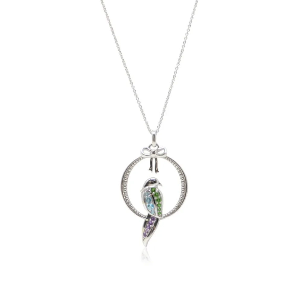 - Materials: Sterling silver, chrome diopside, Swiss blue topaz, amethyst, black spinel