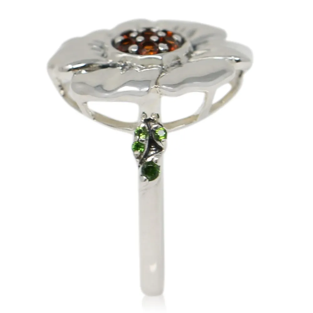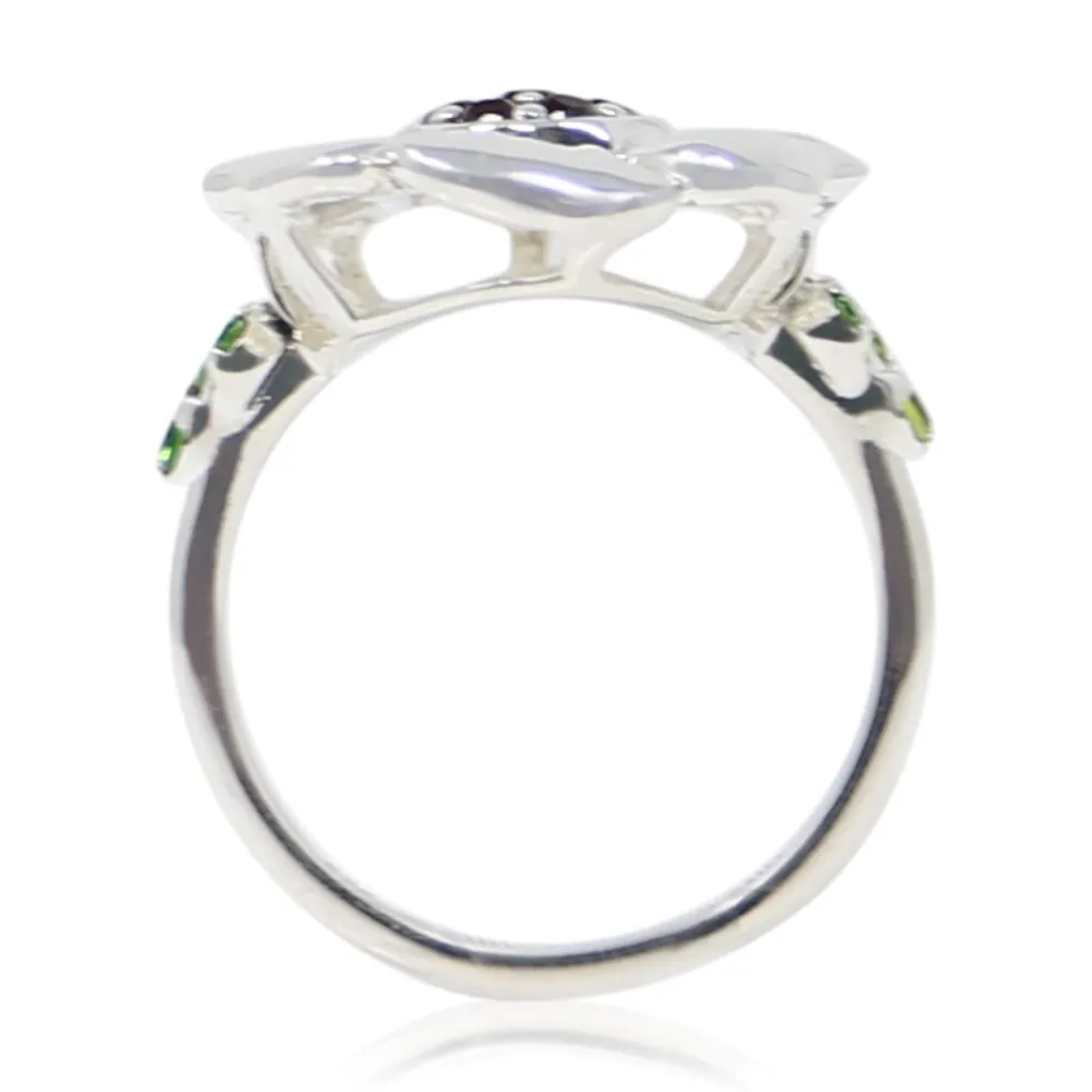 Ring also features chrome diopside, which is a rare translucent variety of the gemstone-quality calcium magnesium silicate. This variety is chromium-rich causing the beautiful green coloration.